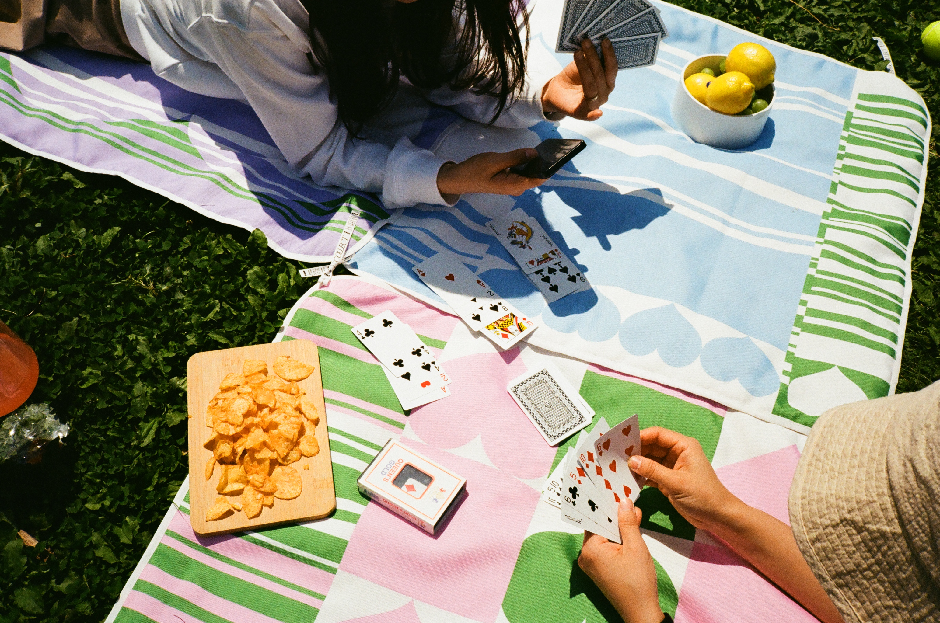 각 돗자리 유닛의 꼭짓점에는 끈을 부착하여 때에 따라 떨어트리거나 서로 붙여 다양한 모양으로 사용할 수 있도록 구성했습니다.